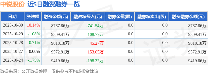 中锐股份融资融券信息显示,融资方面,当日融资买入480.2万元,融资偿还1221.74万元,融资净偿还741.54万元。融券方面,融券卖出0.0股,融券偿还0.0股,融券余量0.0股,融券余额0.0万元。融资融券余额8767.86万元。