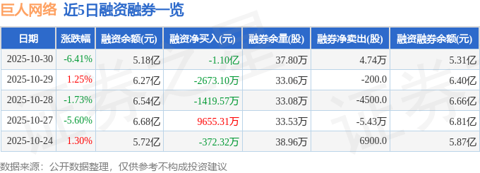 证券之星消息,截至2025年10月30日收盘,巨人网络(002558)报收于35.49元,下跌6.41%,换手率5.52%,成交量106.71万手,成交额37.85亿元。