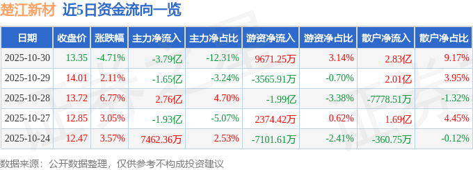 证券之星消息,截至2025年10月30日收盘,楚江新材(002171)报收于13.35元,下跌4.71%,换手率14.11%,成交量227.74万手,成交额30.8亿元。