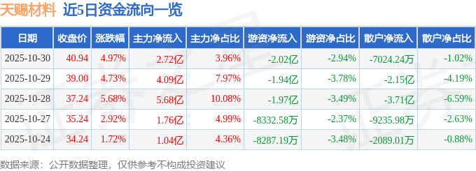 证券之星消息,截至2025年10月30日收盘,天赐材料(002709)报收于40.94元,上涨4.97%,换手率12.25%,成交量169.66万手,成交额68.84亿元。