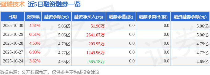 强瑞技术融资融券信息显示,融资方面,当日融资买入1.14亿元,融资偿还1.14亿元,融资净买入51.9万元,连续3日净买入累计2896.92万元。融券方面,融券卖出0.0股,融券偿还0.0股,融券余量0.0股,融券余额0.0万元。融资融券余额5.06亿元。