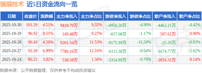 证券之星消息,截至2025年10月30日收盘,强瑞技术(301128)报收于101.29元,上涨4.51%,换手率11.53%,成交量10.18万手,成交额10.11亿元。