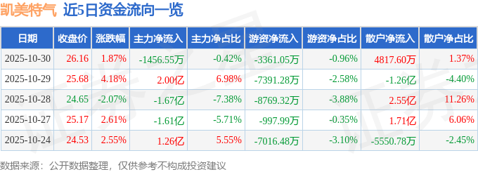 证券之星消息,截至2025年10月30日收盘,凯美特气(002549)报收于26.16元,上涨1.87%,换手率19.21%,成交量132.97万手,成交额35.06亿元。