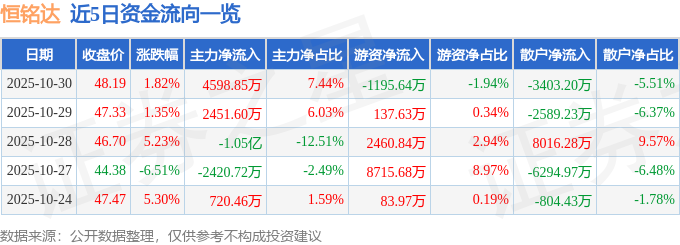 证券之星消息,截至2025年10月30日收盘,恒铭达(002947)报收于48.19元,上涨1.82%,换手率6.72%,成交量12.93万手,成交额6.18亿元。
