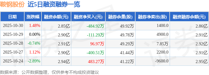 鞍钢股份融资融券信息显示,融资方面,当日融资买入790.88万元,融资偿还1275.8万元,融资净偿还484.92万元。融券方面,融券卖出8700.0股,融券偿还7300.0股,融券余量49.92万股,融券余额136.78万元。融资融券余额2.86亿元。