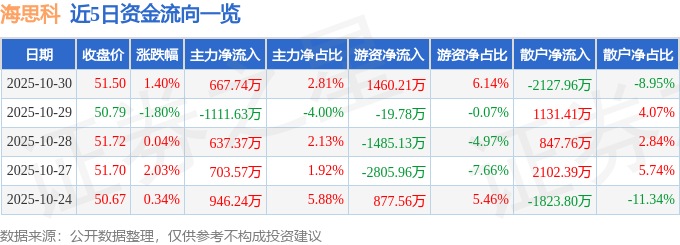 证券之星消息,截至2025年10月30日收盘,海思科(002653)报收于51.5元,上涨1.4%,换手率0.97%,成交量4.66万手,成交额2.38亿元。