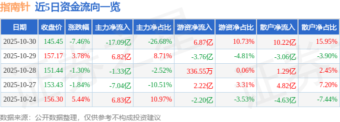 证券之星消息,截至2025年10月30日收盘,指南针(300803)报收于145.45元,下跌7.46%,换手率7.13%,成交量42.68万手,成交额64.06亿元。