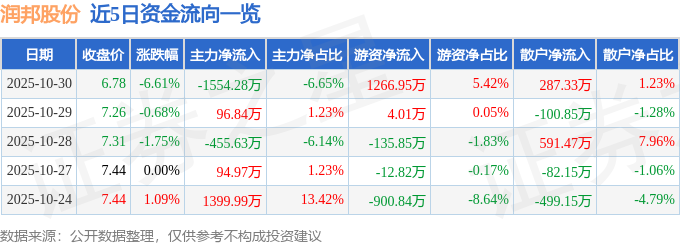 证券之星消息,截至2025年10月30日收盘,润邦股份(002483)报收于6.78元,下跌6.61%,换手率3.83%,成交量33.9万手,成交额2.34亿元。