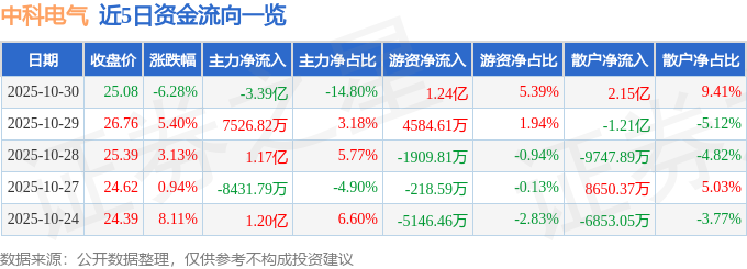 证券之星消息,截至2025年10月30日收盘,中科电气(300035)报收于25.08元,下跌6.28%,换手率15.4%,成交量89.81万手,成交额22.91亿元。