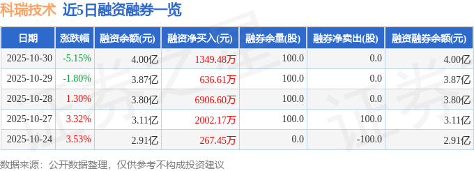 科瑞技术融资融券信息显示,融资方面,当日融资买入7487.54万元,融资偿还6138.06万元,融资净买入1349.48万元,连续3日净买入累计8892.68万元。融券方面,融券卖出0.0股,融券偿还0.0股,融券余量100.0股,融券余额0.22万元。融资融券余额4.0亿元。