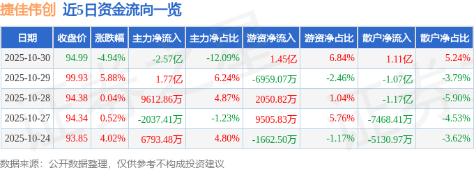 证券之星消息,截至2025年10月30日收盘,捷佳伟创(300724)报收于94.99元,下跌4.94%,换手率7.61%,成交量21.9万手,成交额21.24亿元。