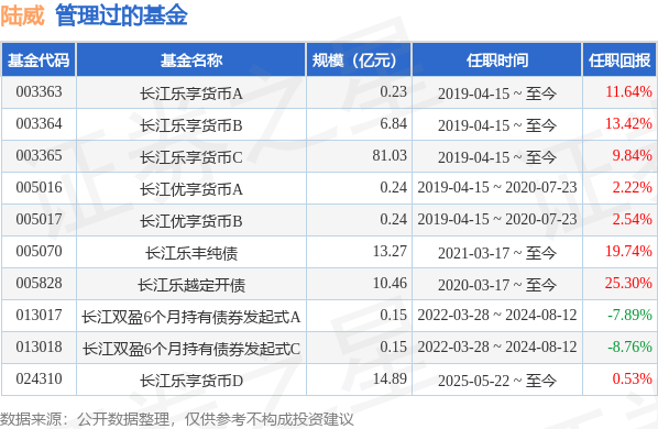 陆威先生:中国国籍,本科学士。曾任国联证券股份有限公司投资助理、东兴证券股份有限公司投资经理、长江证券(上海)资产管理有限公司基金经理助理。2019年04月15日至2020年07月22日任长江优享货币市场基金的基金经理,自2019年04月15日起至今任长江乐享货币市场基金的基金经理,自2020年03月17日起至今任长江乐越定期开放债券型发起式证券投资基金的基金经理,自2021年03月17日起至今任长江乐丰纯债定期开放债券型发起式证券投资基金的基金经理,自2022年03月28日起至2024年9月10日任长江双盈6个月持有期债券型发起式证券投资基金的基金经理。
