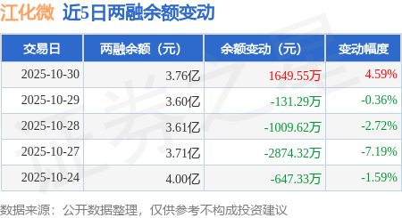 证券之星消息,10月30日,江化微(603078)融资买入6527.57万元,融资偿还4878.01万元,融资净买入1649.55万元,融资余额3.76亿元。