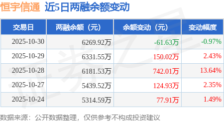 证券之星消息,10月30日,恒宇信通(300965)融资买入483.91万元,融资偿还545.54万元,融资净卖出61.63万元,融资余额6269.92万元。