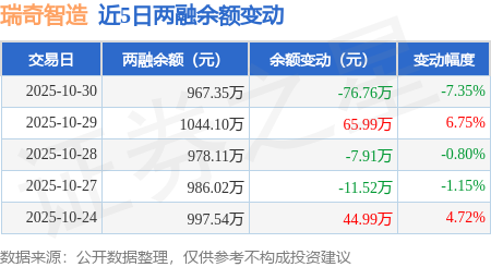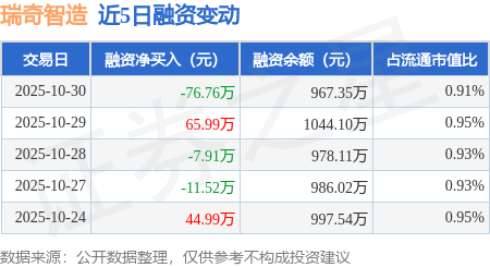 证券之星消息,10月30日,瑞奇智造(920781)融资买入74.35万元,融资偿还151.11万元,融资净卖出76.76万元,融资余额967.35万元。