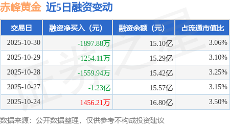 证券之星消息,10月30日,赤峰黄金(600988)融资买入1.05亿元,融资偿还1.24亿元,融资净卖出1897.88万元,融资余额15.1亿元。