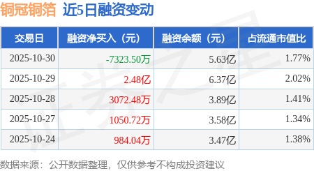 证券之星消息,10月30日,铜冠铜箔(301217)融资买入3.38亿元,融资偿还4.11亿元,融资净卖出7323.5万元,融资余额5.63亿元,近20个交易日中有11个交易日出现融资净买入。