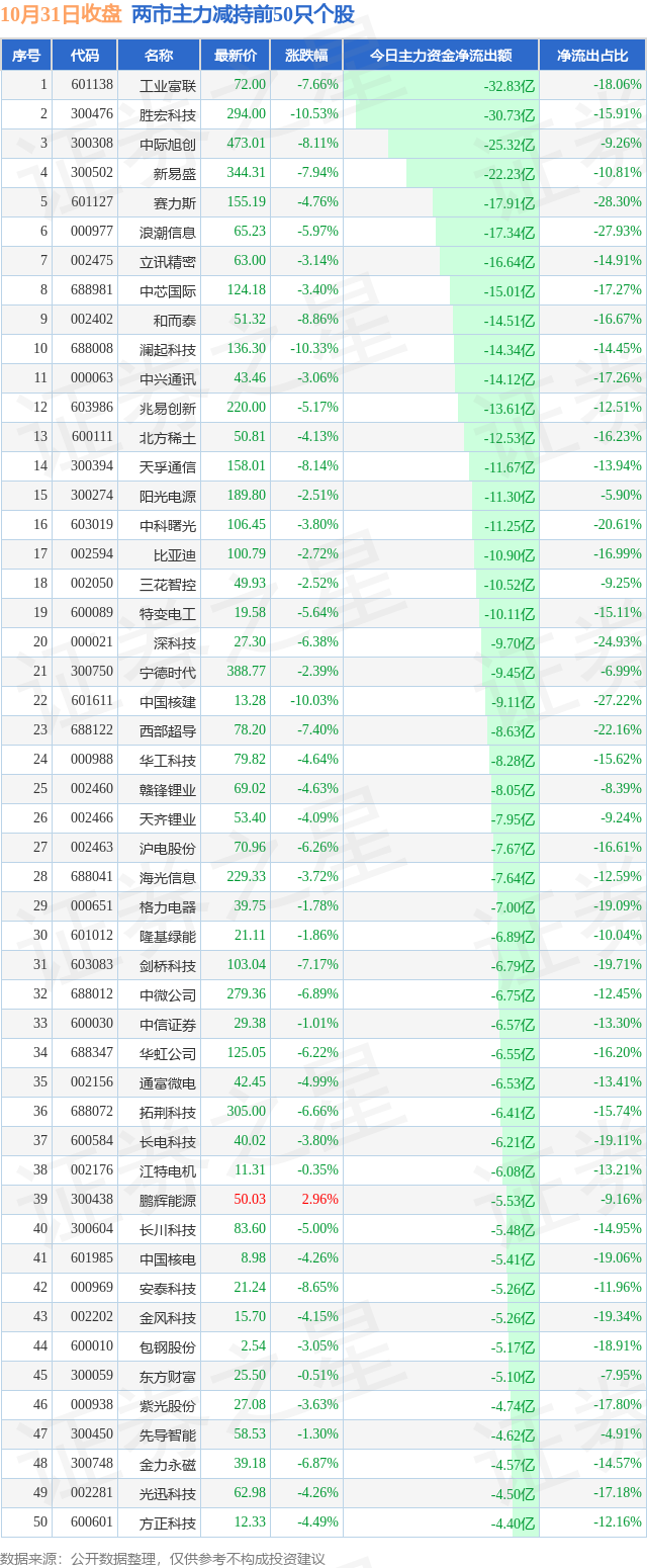 两市主力减持最多的前十只个股为:
