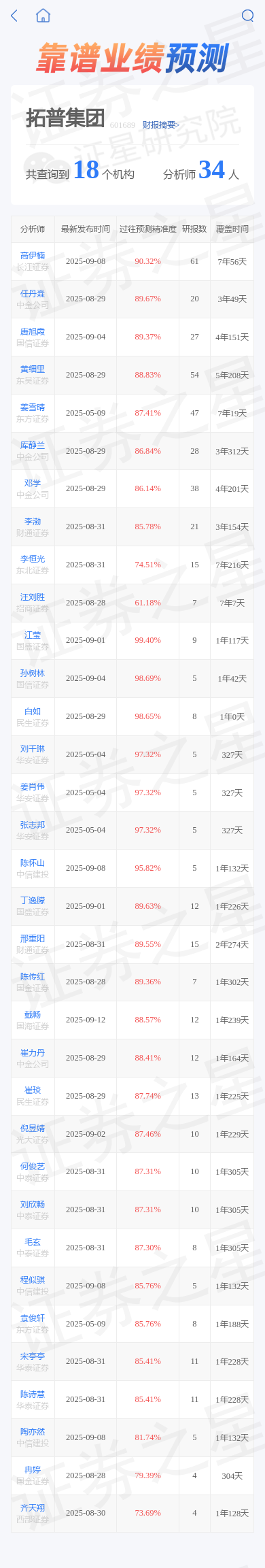 如果您对这家公司感兴趣,可以参考证星研究院统计的拓普集团的分析师业绩预测数据,其中根据长江证券的分析师高伊楠预测公司未来PE为25.0(更多特色估值数据尽在证星研究院,所有数据均来源公开资料,期且所有资料都存在一定时间滞后,所有相关数据均不可作为投资决策单一依据)。