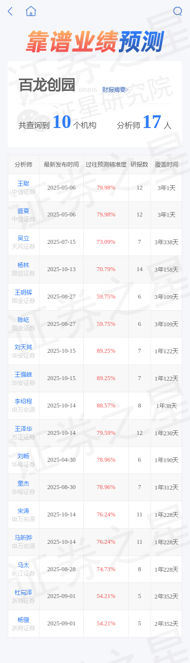 如果您对这家公司感兴趣,可以参考证星研究院统计的百龙创园的分析师业绩预测数据,其中根据中信证券的分析师王聪预测公司未来PE为13.0(更多特色估值数据尽在证星研究院,所有数据均来源公开资料,期且所有资料都存在一定时间滞后,所有相关数据均不可作为投资决策单一依据)。
