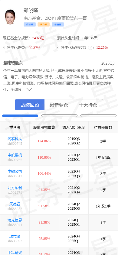 概伦电子(688206)是基金经理郑晓曦的重仓股。,其在整个职业生涯内年化收益高达20.37%。郑晓曦的大佬持仓 - 战绩回顾截图如下: