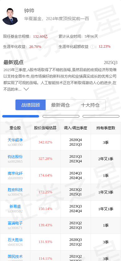 方正科技(600601)是基金经理钟帅的重仓股。,其在整个职业生涯内年化收益高达20.7%。钟帅的大佬持仓 - 战绩回顾截图如下: