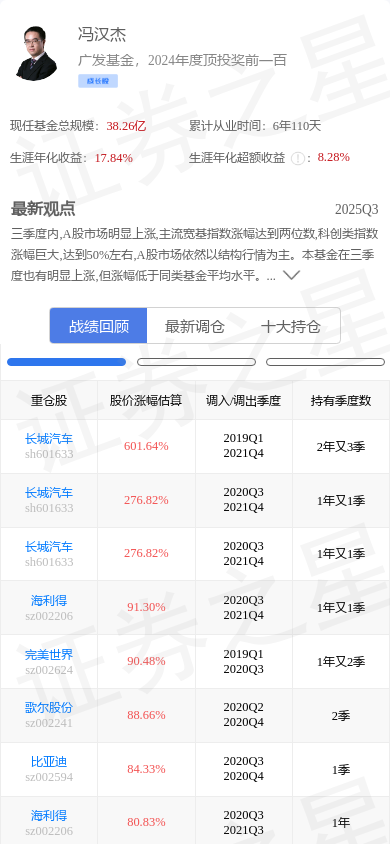 湖南黄金(002155)是基金经理冯汉杰的重仓股。,其在整个职业生涯内年化收益高达17.84%。冯汉杰的大佬持仓 - 战绩回顾截图如下: