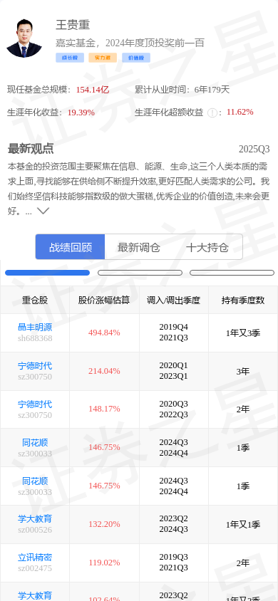 新宙邦(300037)是基金经理王贵重的重仓股。,其在整个职业生涯内年化收益高达19.39%。王贵重管理的嘉实科技创新混合基金在2020年2季度调入新宙邦,在持有3个季度后在2021年1季度调出,持有期间的估算收益率达到90.82%。(以上数据经过后复权近似计算)王贵重的大佬持仓 - 战绩回顾截图如下: