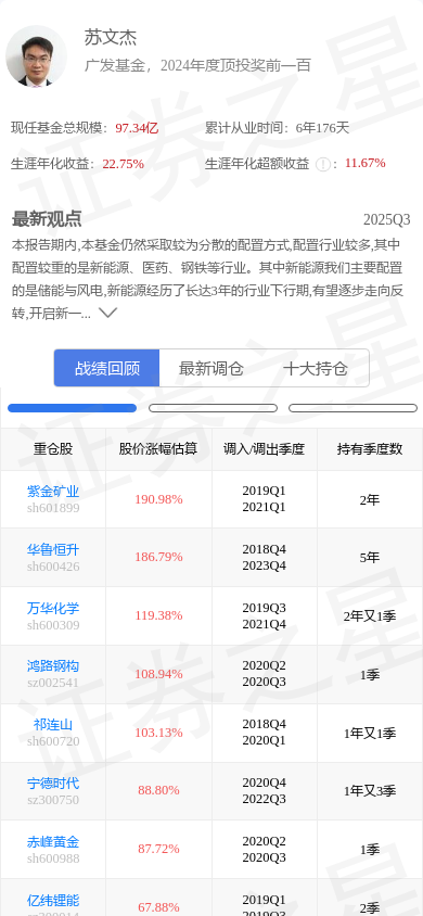洛阳钼业(603993)是基金经理苏文杰的重仓股。,其在整个职业生涯内年化收益高达22.75%。苏文杰管理的嘉实碳中和主题混合A基金在2023年3季度调入洛阳钼业,在持有2个季度后在2024年1季度调出,持有期间的估算收益率达到3.35%。(以上数据经过后复权近似计算)苏文杰的大佬持仓 - 战绩回顾截图如下: