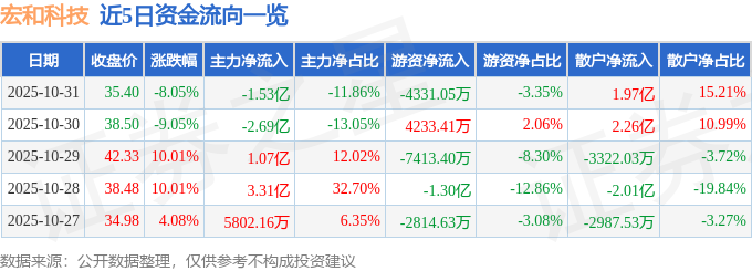 证券之星消息,截至2025年10月31日收盘,宏和科技(603256)报收于35.4元,下跌8.05%,换手率4.03%,成交量35.48万手,成交额12.93亿元。