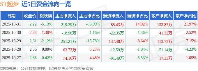 证券之星消息,截至2025年10月31日收盘,ST起步(603557)报收于2.22元,下跌5.13%,换手率0.44%,成交量2.74万手,成交额609.3万元。