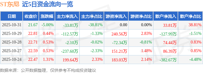 证券之星消息,截至2025年10月31日收盘,ST东尼(603595)报收于21.67元,下跌5.0%,换手率0.02%,成交量402.0手,成交额87.11万元。