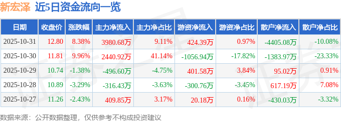 证券之星消息,截至2025年10月31日收盘,新宏泽(002836)报收于12.8元,上涨8.38%,换手率15.41%,成交量35.51万手,成交额4.37亿元。