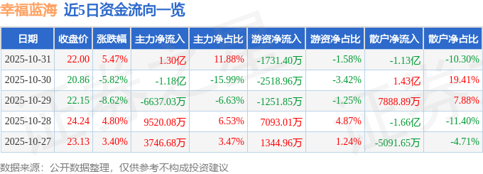 证券之星消息,截至2025年10月31日收盘,幸福蓝海(300528)报收于22.0元,上涨5.47%,换手率13.2%,成交量49.18万手,成交额10.93亿元。