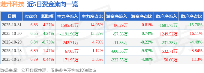 证券之星消息,截至2025年10月31日收盘,琏升科技(300051)报收于6.83元,上涨4.27%,换手率4.26%,成交量15.65万手,成交额1.07亿元。