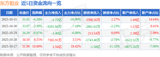 证券之星消息,截至2025年10月31日收盘,东方钽业(000962)报收于31.02元,下跌6.2%,换手率6.39%,成交量32.05万手,成交额10.19亿元。