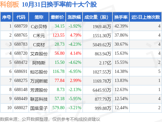 当日科创板换手率前10大个股中3只个股收涨,平均涨幅3.97%,其中C必贝特(688759)以换手率42.39%排第一,8只个股近5个交易日中多次上榜。