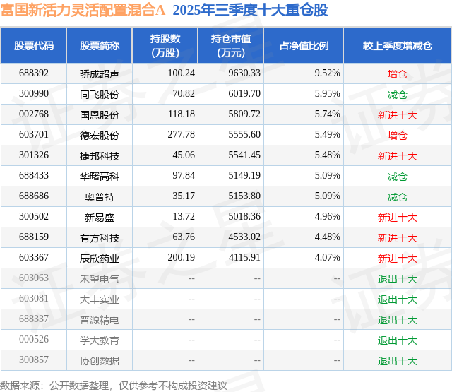 根据2025基金Q3季报公募基金重仓股数据,重仓该股的公募基金共2家,其中持有数量最多的公募基金为富国基金的富国新活力灵活配置混合A。富国新活力灵活配置混合A目前规模为4.13亿元,最新净值3.2283(10月30日),较上一交易日下跌3.41%,近一年上涨36.75%。该公募基金现任基金经理为吴栋栋。吴栋栋在任的基金产品包括:富国质量成长6个月持有混合A,管理时间为2022年2月28日至今,期间收益率为47.38%;富国核心优势混合发起式A,管理时间为2023年12月1日至今,期间收益率为80.01%。