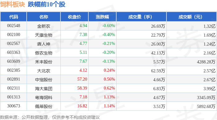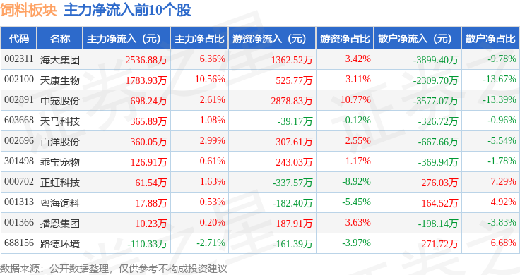 从资金流向上来看,当日饲料板块主力资金净流入274.95万元,游资资金净流入6552.47万元,散户资金净流出6827.43万元。饲料板块个股资金流向见下表: