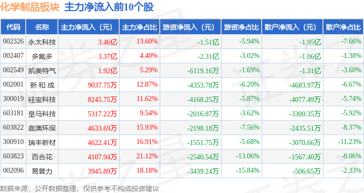 从资金流向上来看,当日化学制品板块主力资金净流入8.81亿元,游资资金净流出8.67亿元,散户资金净流出1400.95万元。化学制品板块个股资金流向见下表: