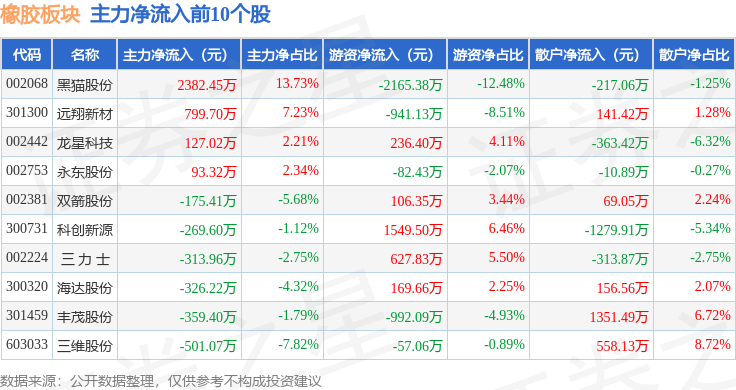 从资金流向上来看,当日橡胶板块主力资金净流出1.88亿元,游资资金净流出1002.13万元,散户资金净流入1.98亿元。橡胶板块个股资金流向见下表: