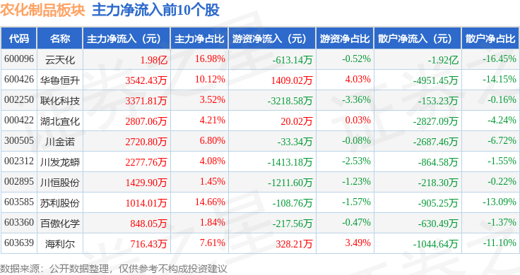 从资金流向上来看,当日农化制品板块主力资金净流出1.73亿元,游资资金净流入2426.67万元,散户资金净流入1.49亿元。农化制品板块个股资金流向见下表: