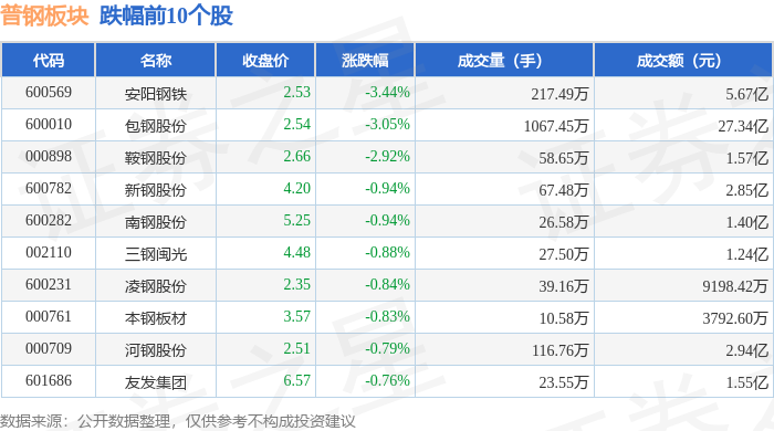 证券之星消息,10月31日普钢板块较上一交易日下跌0.21%,安阳钢铁领跌。当日上证指数报收于3954.79,下跌0.81%。深证成指报收于13378.21,下跌1.14%。普钢板块个股涨跌见下表: