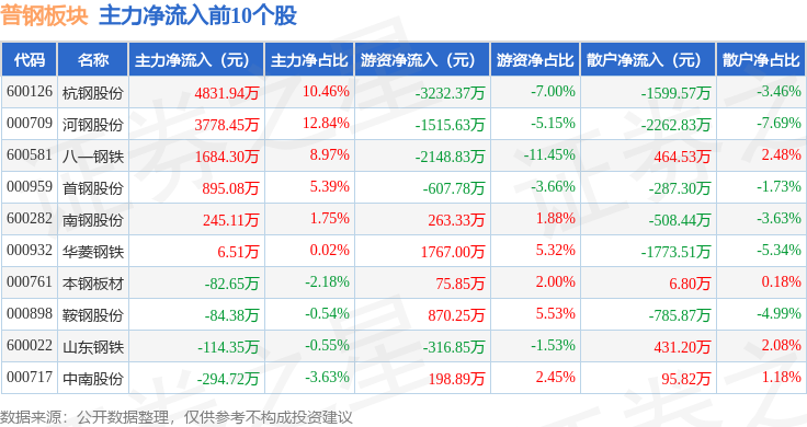 从资金流向上来看,当日普钢板块主力资金净流出7.01亿元,游资资金净流入1.16亿元,散户资金净流入5.85亿元。普钢板块个股资金流向见下表: