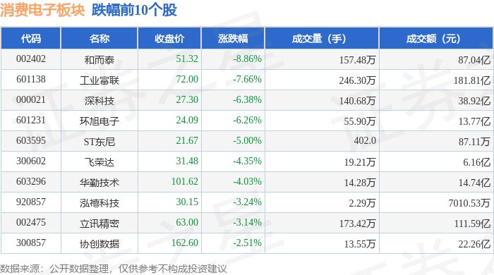 证券之星消息,10月31日消费电子板块较上一交易日下跌4.28%,和而泰领跌。当日上证指数报收于3954.79,下跌0.81%。深证成指报收于13378.21,下跌1.14%。消费电子板块个股涨跌见下表: