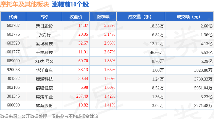 证券之星消息,10月31日摩托车及其他板块较上一交易日上涨1.5%,新日股份领涨。当日上证指数报收于3954.79,下跌0.81%。深证成指报收于13378.21,下跌1.14%。摩托车及其他板块个股涨跌见下表: