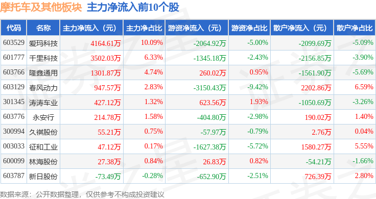 从资金流向上来看,当日摩托车及其他板块主力资金净流入8089.17万元,游资资金净流出7816.11万元,散户资金净流出273.05万元。摩托车及其他板块个股资金流向见下表: