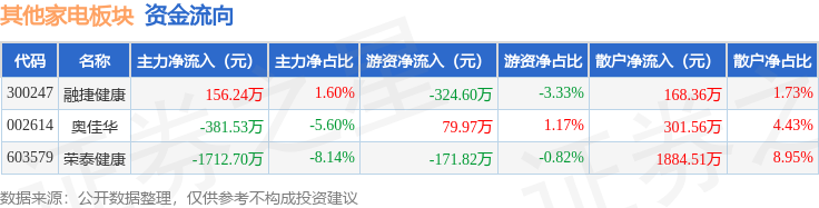 从资金流向上来看,当日其他家电板块主力资金净流出1937.98万元,游资资金净流出416.45万元,散户资金净流入2354.43万元。其他家电板块个股资金流向见下表: