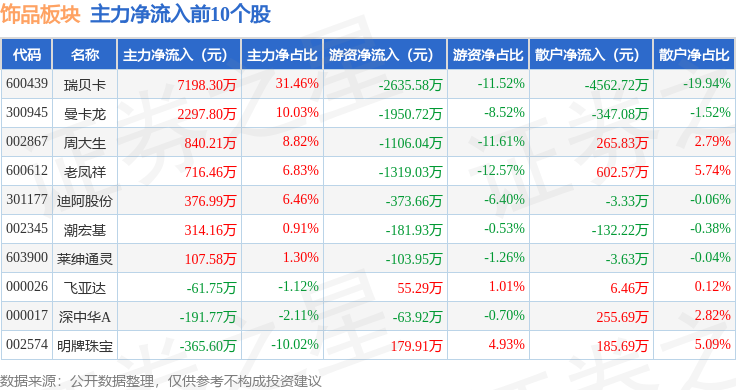 从资金流向上来看,当日饰品板块主力资金净流入5010.24万元,游资资金净流出2152.67万元,散户资金净流出2857.58万元。饰品板块个股资金流向见下表: