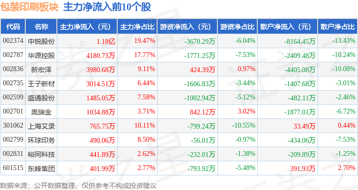 从资金流向上来看,当日包装印刷板块主力资金净流入2888.4万元,游资资金净流出6436.08万元,散户资金净流入3547.69万元。包装印刷板块个股资金流向见下表: